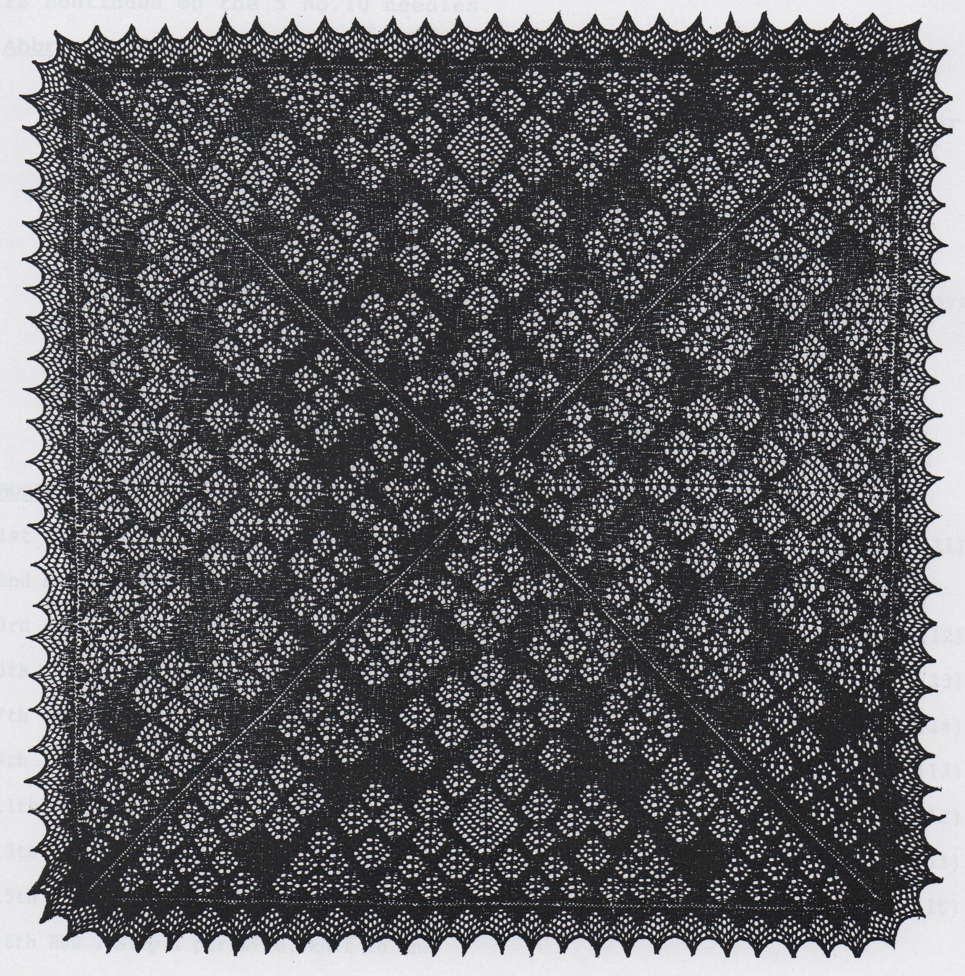 Large square shawl, suitable for an heirloom piece or eveningwear. Designed by Gladys Amedro, this pattern is written out line by line and uses old abbreviations which you may not be familiar with although once learnt they are simple to follow.