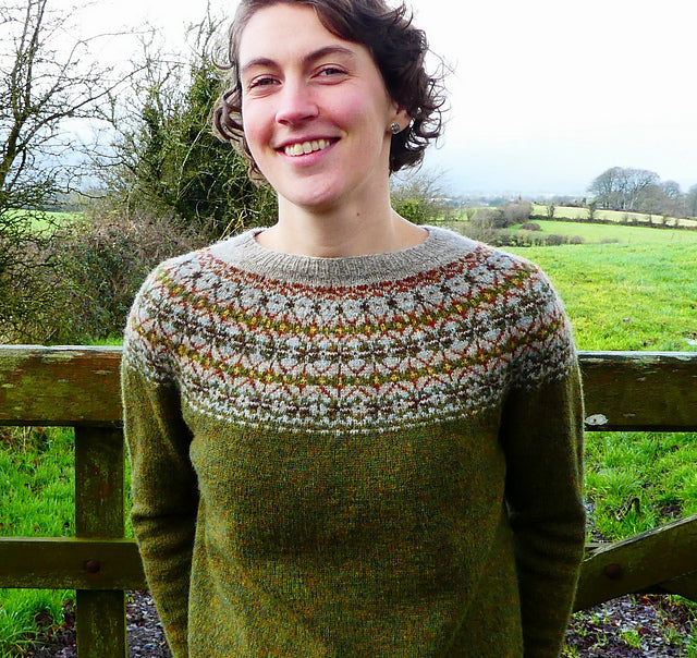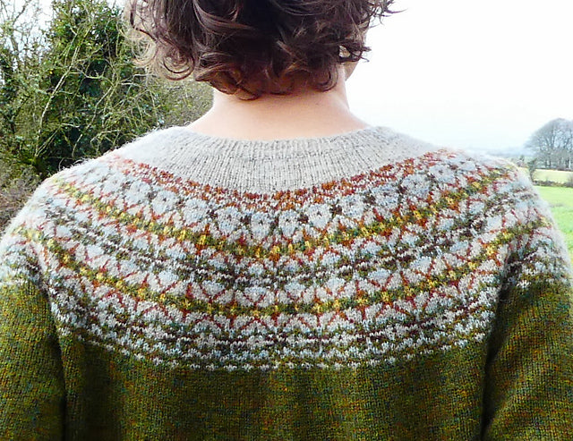 DALRIADA yoked sweater is knitted from the top down using Jamieson & Smithís 2 Ply Jumper Weight yarn. After the rib neckband, German short rows are used at the back neck before working the colourwork yoke. Top-down construction allows the knitter to try the jumper on at an early stage, and there is no need for grafting as the sleeve underarm stitches are picked up and knitted from the bodyís underarm stitches.