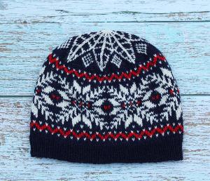 Paper copy of the Haakon Hat, designed by Sandra Manson using our 5ply Shetland Yarn. Its a striking Fair Isle hat featuring a Norwegian Star and snowflake crown, combining our Shetland and Scandinavian influences.