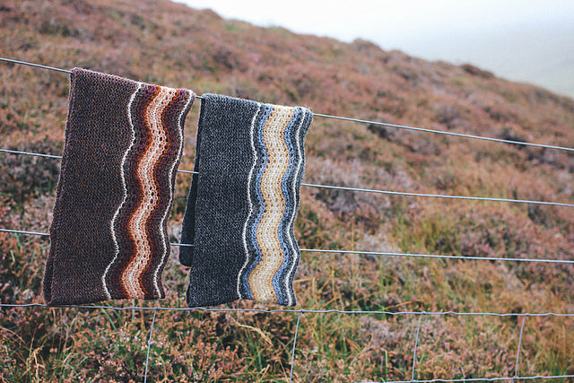 Paper copy of the Hap Cowl, a circular cowl inspired by the elements of traditional Shetland Haps and designed by Ella Gordon, worked flat and then seamed this cowl uses garter stitch, simple lace and colour changes for a surprisingly easy but effective looking knit. The two colourways are inspired by nature in Shetland: Colourway 1 is inspired by the sea, sand and cliffís whereas Colourway two is inspired by the heather, peat banks and moss you can see all over Shetland.