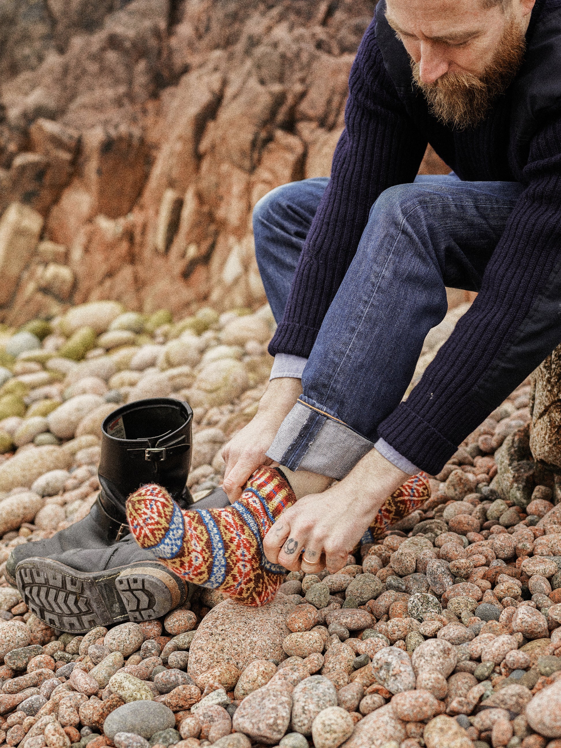 This kit contains the yarn and pattern to knit the Houss Socks by Lesley Smith, originally featured in our book Jamieson & Smith A Shetland Story. They are knit using Shetland Heritage held doubled. Using traditional motifs and colours these socks are both classic and cosy.