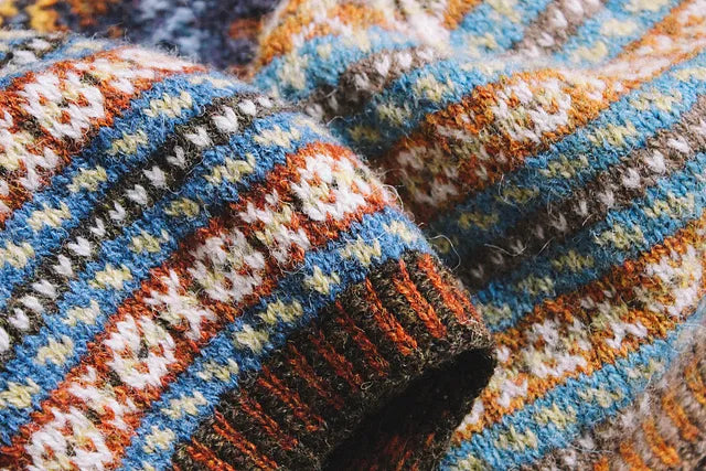 Paper Copy of the Hesti Hat by Ella Gordon, Originally featured in Shetland Wool Adventures Journal Volume 1, this hat is inspired by traditional Fair Isle motifs and colours, using bands of peerie patterns combined with shades you see in early Fair Isle knitting but just that bit different (rusty orange instead of madder red, denim blue in place of indigo etc) which makes it feel like a vintage piece of knitwear.