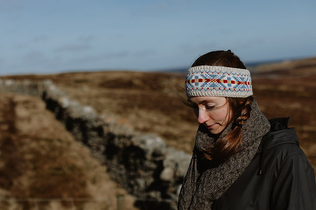 This headband is worked by provisionally casting on in waste yarn, and then working the colourwork chart. You then add a twisted rib border and cast off using a tubular cast-off. Next, you remove the provisional cast-on and work a matching border and cast-off. There are 2 different colourways to choose from.