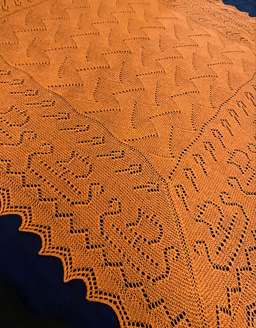 Kit to make the Orange version of the Up Helly Aa Hap, for over 45 years Betsy has thought about a hap with Viking galleys/longships but it never came to fruition, this is the design which Elizabeth and her mother came up with. The hap features the galleys sitting upon the waves with the torches from the Up Helly Aa procession above. The centre represents the flames of the burning galley on its way to Valhalla. Up Helly Aa is a Viking fire festival; they take place in Shetland beginning in January, to celebrate the end of winter and the coming of spring.